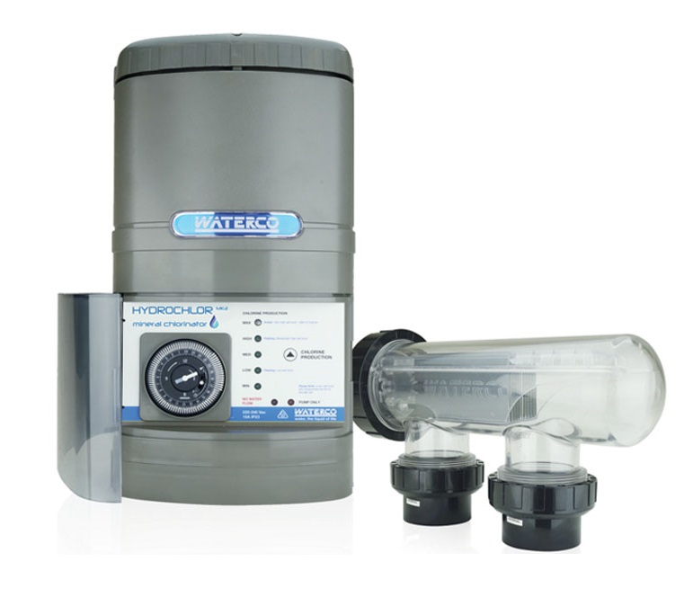 Thiết bị khử trùng muối bằng clo cho hồ bơi của Waterco sử dụng quá trình điện phân chuyển đổi muối chảy qua tế bào điện phân. Muối tan được tách thành hai phần là clo và natri, được chuyển thành clo thành axit hypoChlorous có tác dụng khử trùng, hạn chế sự phát triển của rêu tảo và các sinh vật có hại trong nước hồ bơi. Ta có 2 phương trình điện phân muối sau: